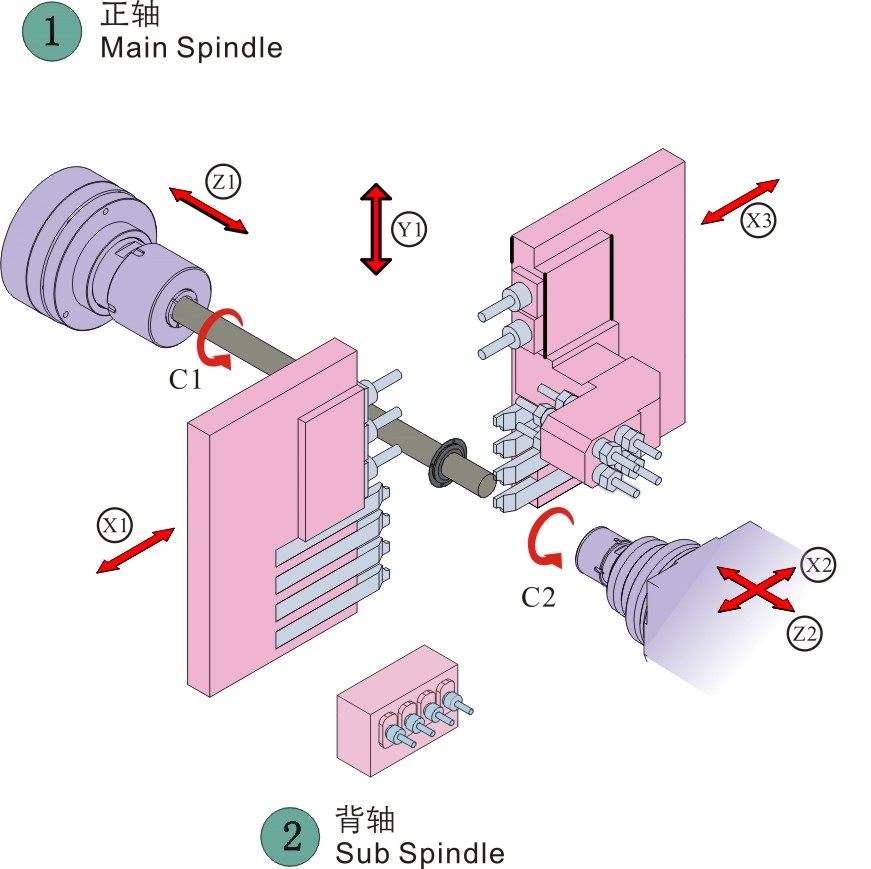 8、三通道控制方式,主轴端双X轴控制两把刀具同时与工件接触,可实现两侧同时铣面、车削、打孔工艺,大大节省了加工效率。